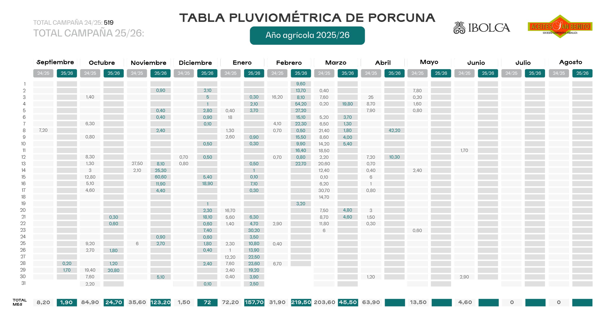 CONOCE LA PLUVIOMETRÍA EN PORCUNA Campaña 2024/2025 Histórico de la pluviometría en Porcuna Año 2017/2018 575,5 l/m2 Año 2018/2019 347 l/m2 Año 2019/2020 633 l/m2 Año 2020/2021 482 l/m2 Año 2021/2022 398,5 l/m2 Año 2022/2023 356 l/m2 Año 2023/2024 568 l/m2 Año 2024/2025 519,90 l/m2